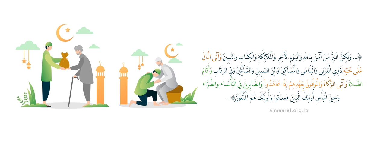 الرابعة: وبعد إقام الصلاة، ذكر الركن العباديّ الثاني، وهو أداء الزكاة والحقوق الماليّة الواجبة: ﴿وَآتَى الزَّكَاةَ﴾. الخامسة: وأشار إلى الركن الأخلاقيّ، وهو الوفاء بالعهد: ﴿وَالْمُوفُونَ بِعَهْدِهِمْ إِذَا عَاهَدُو﴾، فالثقة المتبادلة رأس مال الحياة الاجتماعيّة، وترك الوفاء بالعهد من الذنوب التي تزلزل الثقة، وتُوهن عرى العلاقات الاجتماعيّة. من هنا، وجب على المسلم أن يلتزم بثلاثة أمور تجاه المسلم والكافر، وإزاء البرّ والفاجر، وهي: الوفاء بالعهد، وأداء الأمانة، واحترام الوالدين. السادسة: الصبر في الشدائد: ﴿وَالصَّابِرِينَ فِي الْبَأْسَاء والضَّرَّاء وَحِينَ الْبَأْسِ﴾، وهو من الأخلاق الحميدة التي هي من أركان البرّ. والمراد بالبأساء الفقر، والضرّاء المرض، وما إليه، وحين البأس شدّة الحرب، وإنّما خصّ اللَّه هذه الثلاث بالذكر، مع أنّ الصبر محمود في جميع الأحوال، لأنّ هذه الثلاث أشدّ البلاءات جميعاً، فمن صبر فيها كان في غيرها أصبر[2]. ثمّ تؤكّد الآية أهمّيّة الأسس الستّة وعظمة من يتحلّى بها، فتقول: ﴿أُولَئِكَ الَّذِينَ صَدَقُوا وَأُولَئِكَ هُمُ الْمُتَّقُونَ﴾. السابعة: كتمان المصائب. أوحى الله تعالى إلى موسى عليه السلام: إنّي إذا أحببت عبداً ابتليته ببلايا لا تقوم لها الجبال، لأنظر كيف صدقه، فإنْ وجدته صابراً اتّخذته وليّاً وحبيباً، وإن وجدته جزوعاً يشكوني إلى خلقي خذلته ولا أبالي[3]. الثامنة: الموافقة بين الظاهر والباطن. وعن أمير المؤمنين عليه السلام قوله: "الصدق سيف الله في أرضه وسمائه، أينما هوى به يقدّه، فإذا أردت أن تعلم: أصادق أنت أم كاذب؟ فانظر في صدق معناك، وعقد-غور- دعواك، وعيّرهُما بقسطاس من الله، كأنّك القيامة، قال الله تعالى: ﴿وَالْوَزْنُ يَوْمَئِذٍ الْحَقُّ فَمَن ثَقُلَتْ مَوَازِينُهُ فَأُوْلَئِكَ هُمُ الْمُفْلِحُونَ﴾[4], فإذا اعتدل معناك بدعواك ثبت لك الصدق، وأدنى حدّ الصدق أنْ لا يخالف اللسان القلب ولا القلب اللسان"[5]. التاسعة: البذل والتضيحة. من علامات الإيمان الصادق أنّه يدفع المؤمن إلى البذل والتضحية، أمّا من يدّعِ الإيمان يبخلْ عن البذل في سبيل الله، ويجبنْ عن الجهاد لإعلاء كلمة الله. فلمّا كانت قلوب المنافقين خالية من الإيمان، قال عنهم الله: ﴿فَرِحَ الْمُخَلَّفُونَ بِمَقْعَدِهِمْ خِلاَفَ رَسُولِ اللّهِ وَكَرِهُواْ أَن يُجَاهِدُواْ بِأَمْوَالِهِمْ وَأَنفُسِهِمْ فِي سَبِيلِ اللّهِ وَقَالُواْ لاَ تَنفِرُواْ فِي الْحَرِّ قُلْ نَارُ جَهَنَّمَ أَشَدُّ حَرًّا لَّوْ كَانُوا يَفْقَهُونَ﴾[6].